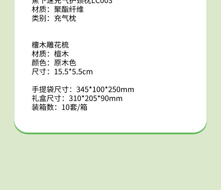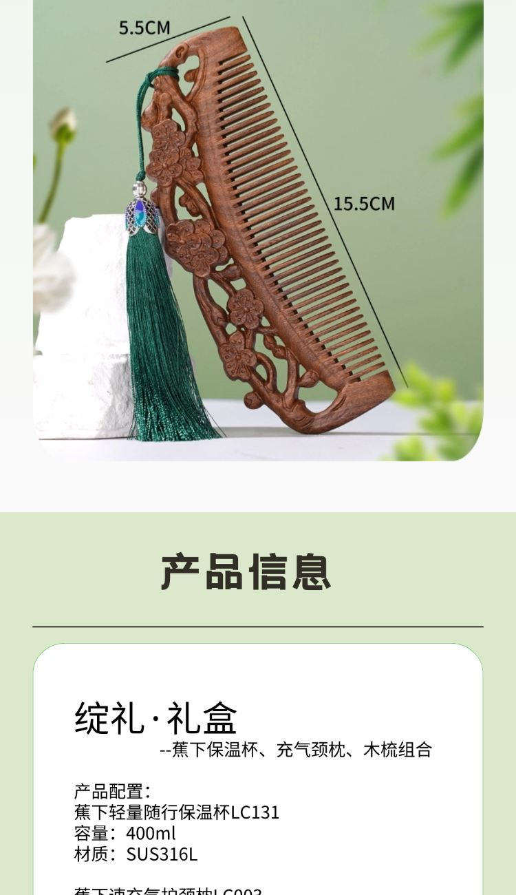 產(chǎn)品配置: 蕉下輕量隨行保溫杯LC131 容量:400ml 材質(zhì):SUS316L 蕉下速充氣護頸枕LC003 材質(zhì):聚酯纖維 類別:充氣枕 檀木雕花梳 材質(zhì):檀木 顏色:原木色 尺寸:15.5*5.5cm 手提袋尺寸:345*100*250mm 禮盒尺寸:310*205*90mm