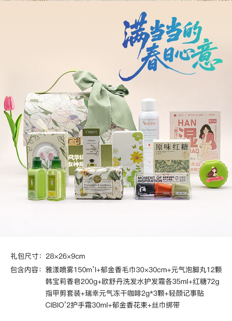 包裝尺寸:28*26*9cm 雅漾噴霧:150ml 瑞幸元?dú)鈨龈煽Х龋?g*3顆 元?dú)馀菽_丸:12顆 原味紅糖:72g 指甲剪套裝 輕顏記事貼 郁金香毛巾:30*30cm 歐舒丹洗發(fā)水護(hù)發(fā)素:各30ml CIBIO'2護(hù)手霜:35ml 韓寶莉香皂:200g 郁金香花束 絲巾綁帶(顏色隨機(jī))