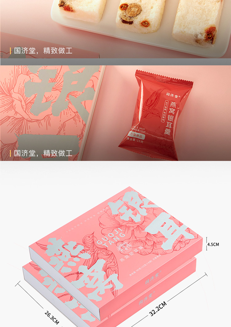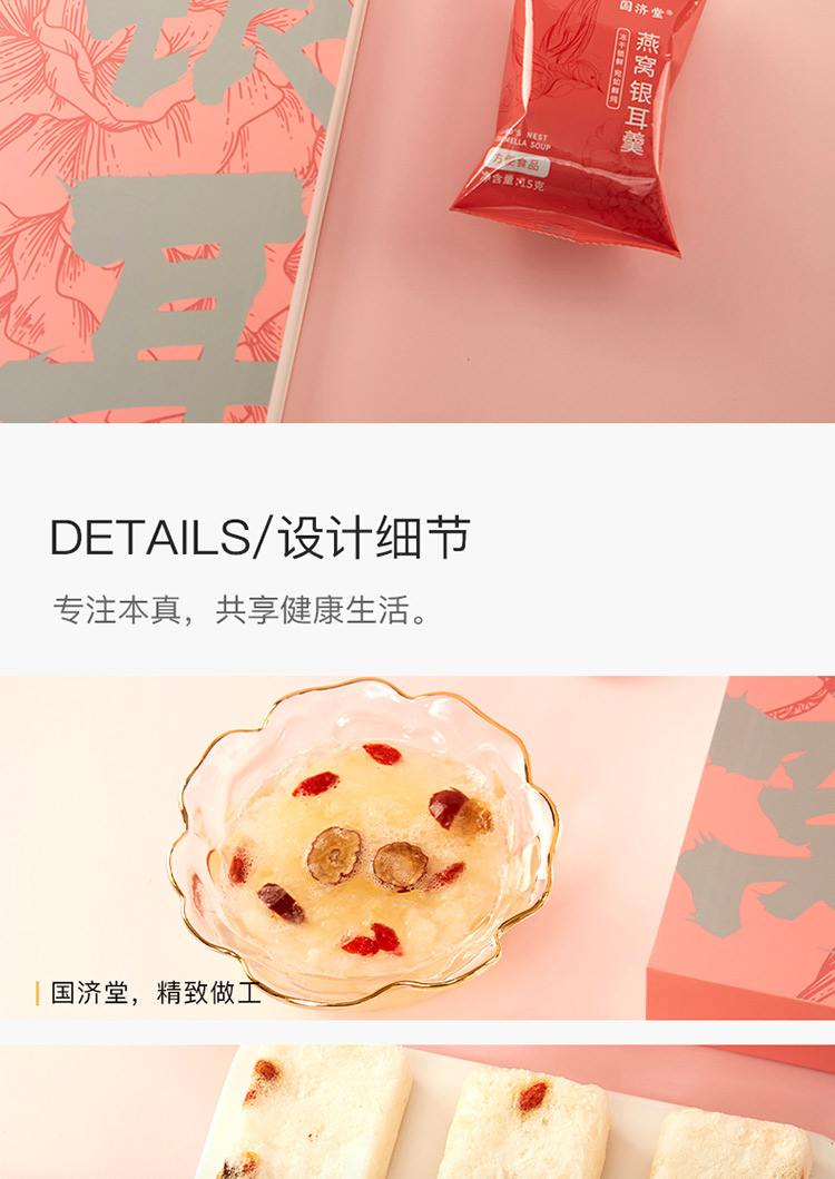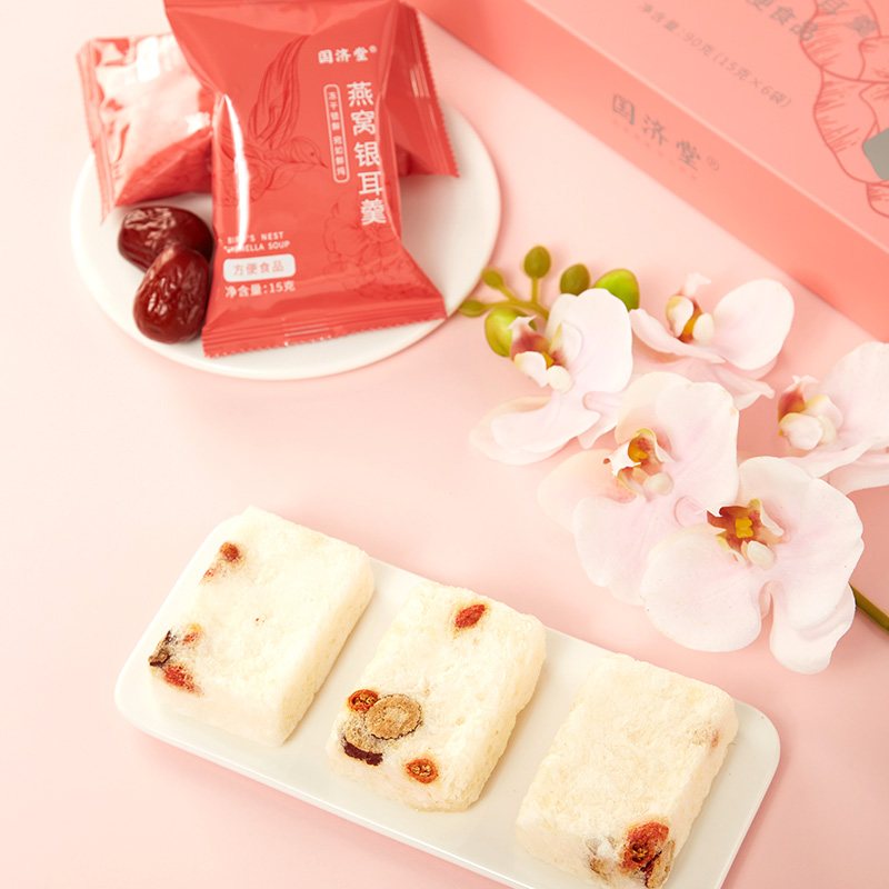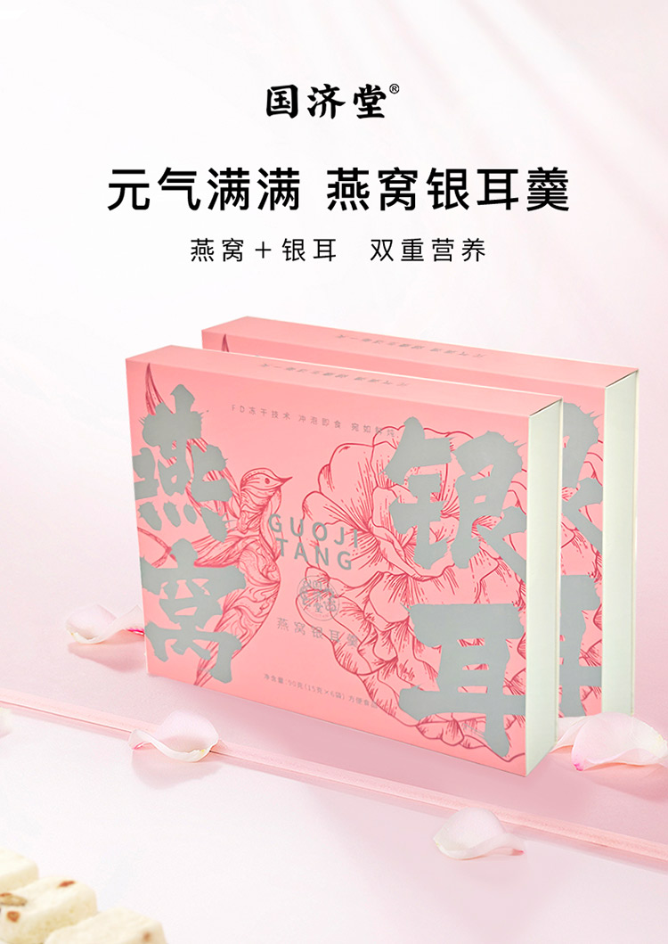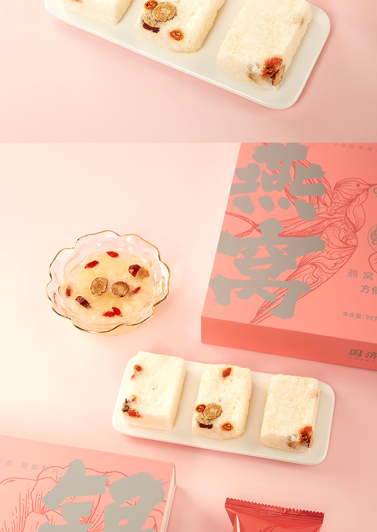 國(guó)濟(jì)堂自行開(kāi)發(fā)設(shè)計(jì)的年輕化、潮流化新產(chǎn)品——燕窩銀耳羹。隨著社會(huì)生活的快節(jié)奏發(fā)展,凍干產(chǎn)品的需求越來(lái)越多,本款采用暖粉+銀配色,更年輕更時(shí)尚。