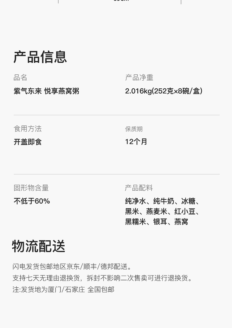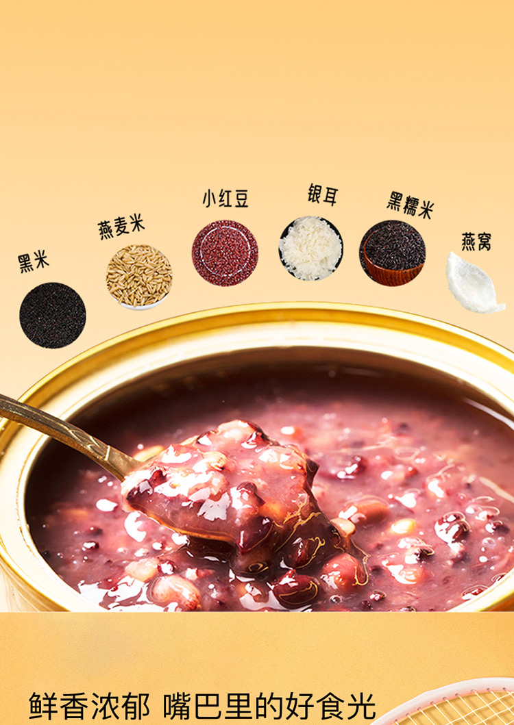 配置:252g*8碗 +勺子*8 /盒 固形物含量≥60% 配料表:純凈水、純牛奶、冰糖、黑米、燕麥米、紅小豆、黑糯米、銀耳、燕窩 食用方法:開蓋即食 凈含量:2016克/盒 保質(zhì)期:12個(gè)月 儲(chǔ)存方法:存放于通風(fēng)干燥處
