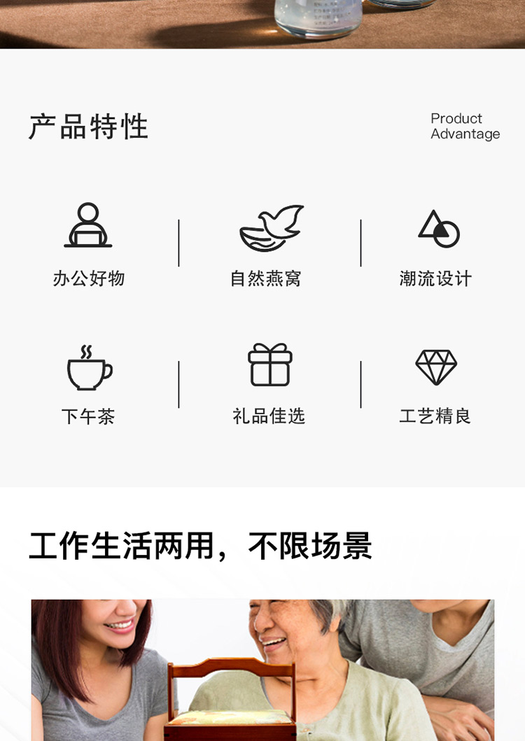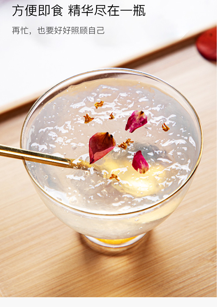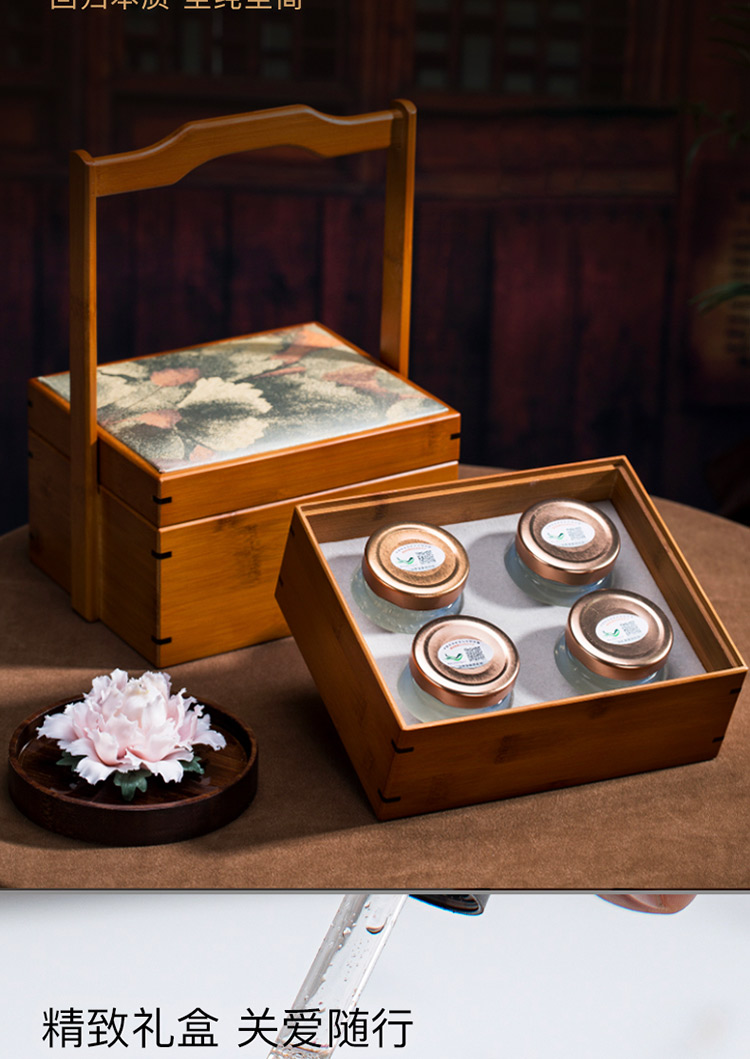規(guī)格: 高濃度燕窩65g*4瓶干燕窩含量≥3克; 手工陶瓷牡丹花*1香薰*1 配料:純凈水、燕窩、冰糖 食用方法:開蓋即食,建議晨起空腹和睡前半小時各飲一瓶 產(chǎn)品特點: 燕窩純手工挑毛,99%潔凈標(biāo)準(zhǔn), 唾液酸含量每瓶不低于248mg 生產(chǎn)過程全程純凈水,SGS國際認(rèn)證, 燕窩含量極高;竹木外盒一物多用 禮盒大氣,女士喜愛。內(nèi)含陶瓷牡丹花、香薰各一種