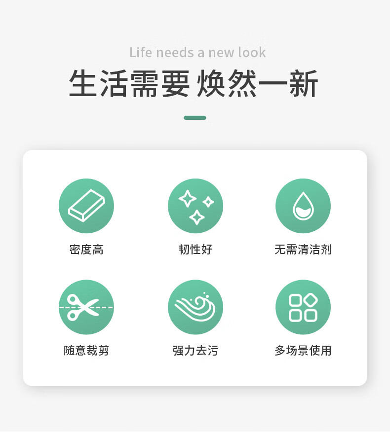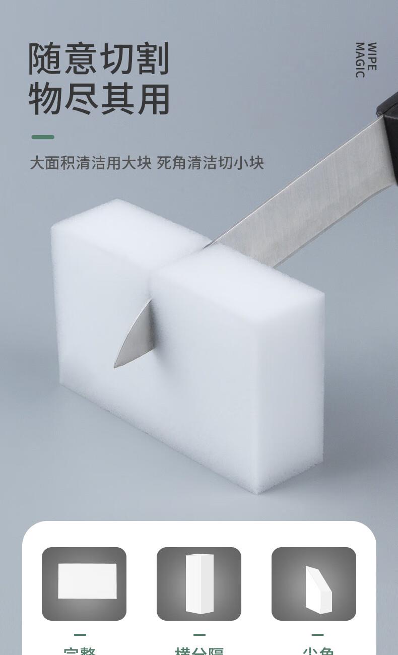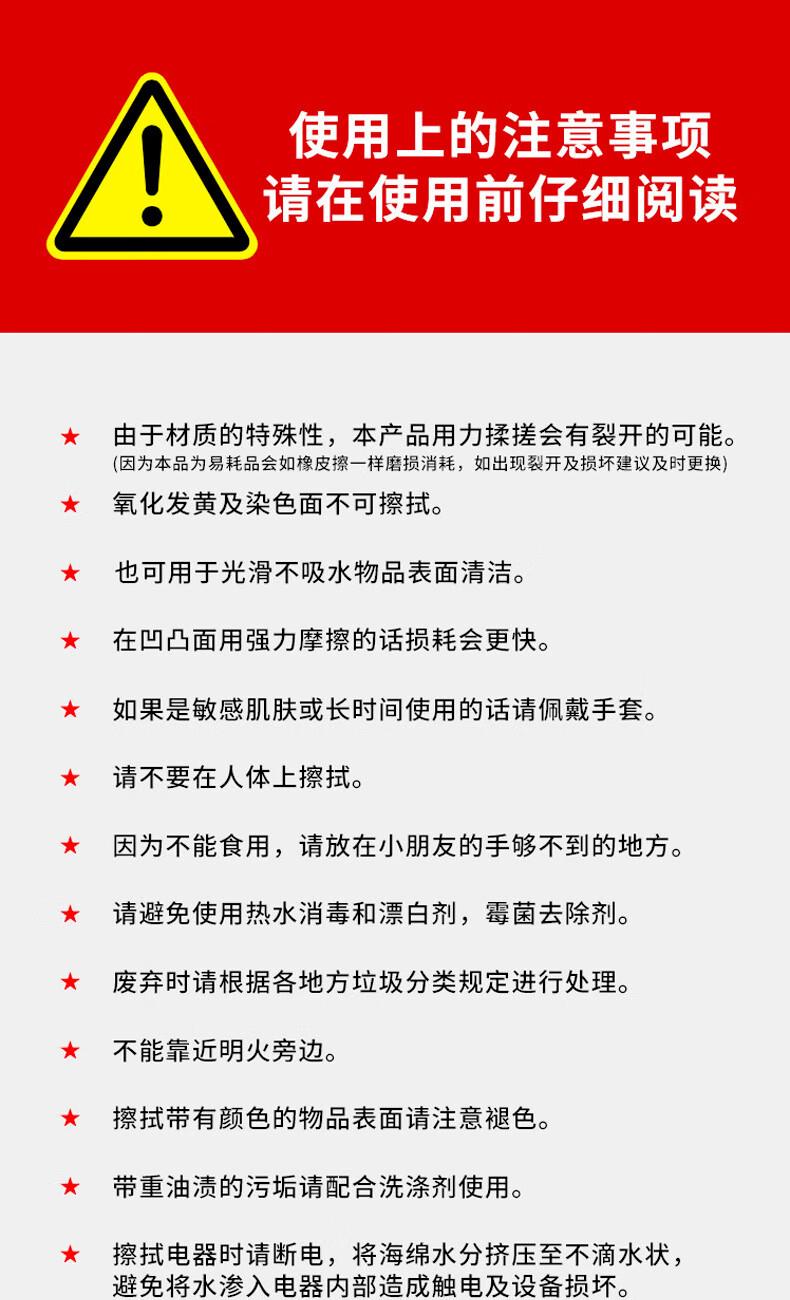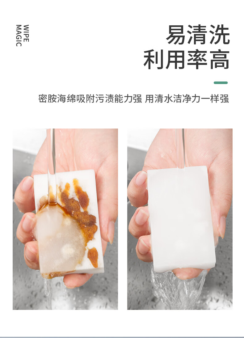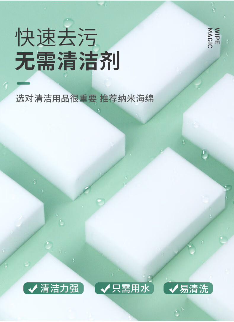 只需用水一擦即凈 各種污漬 輕松搞定 三維網(wǎng)狀結(jié)構(gòu)深層次去污 柔韌性強(qiáng) 不易折斷 易清洗 快速去污無(wú)需清潔劑 選對(duì)清潔用品很重要 推薦納米海綿 只需沾水后輕輕一擦即刻干凈 密胺海綿吸附污漬能力強(qiáng) 用清水潔凈力一樣強(qiáng) 隨意切割物盡其用 大面積清潔用大塊 死角清潔切小塊