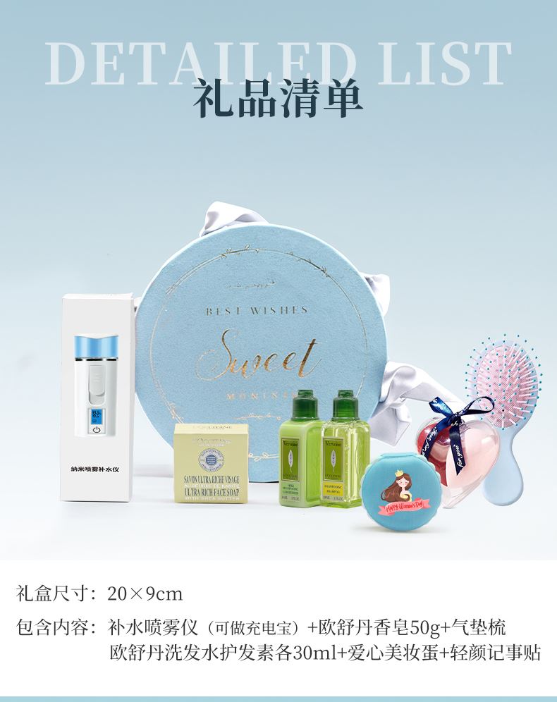 包裝尺寸:20*9cm 補水噴霧儀(可用作充電寶) 歐舒丹洗發(fā)水護發(fā)素:各30ml 輕顏記事貼 歐舒丹乳木果香皂:50g 氣墊梳子 愛心美妝蛋