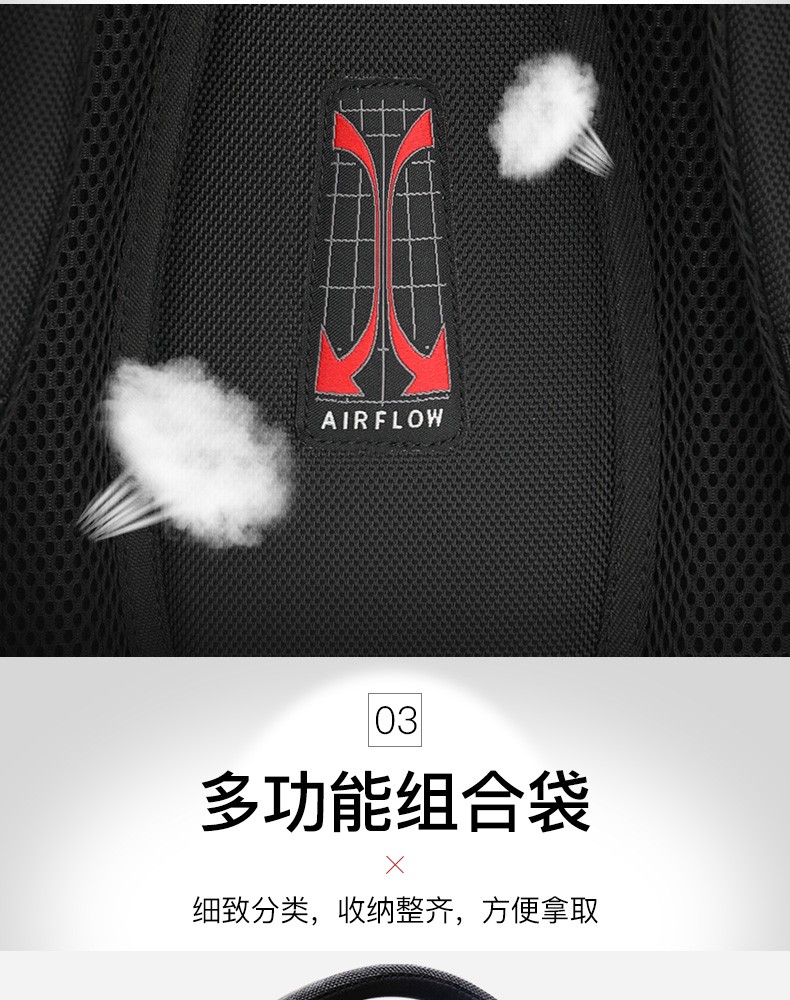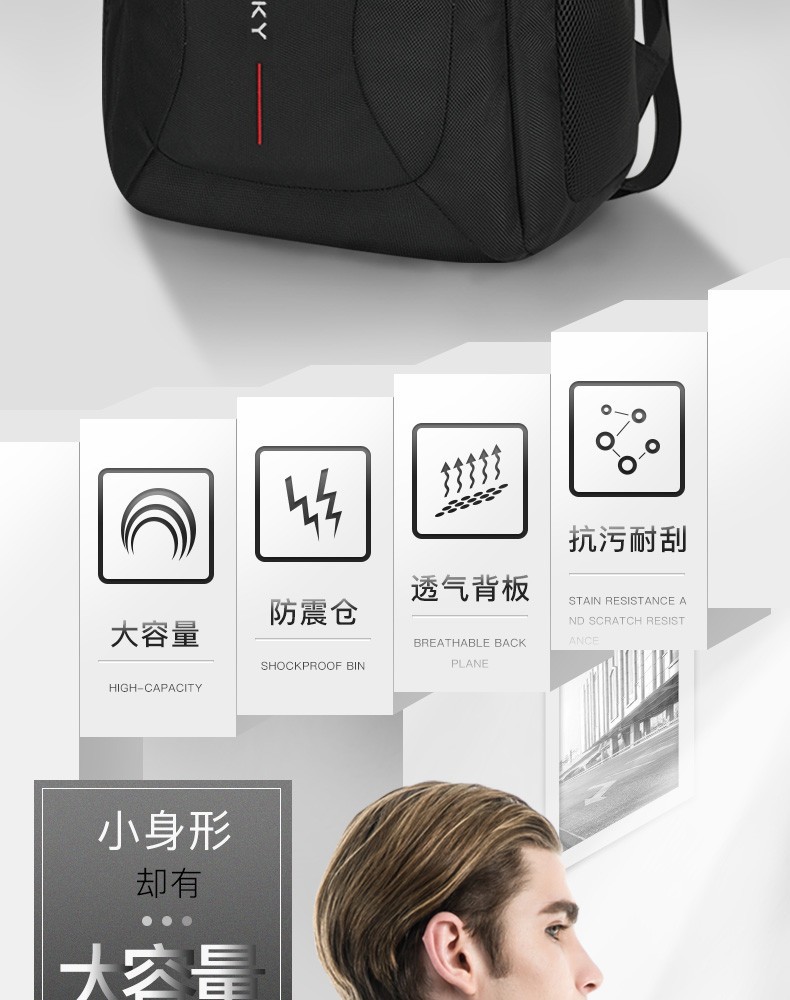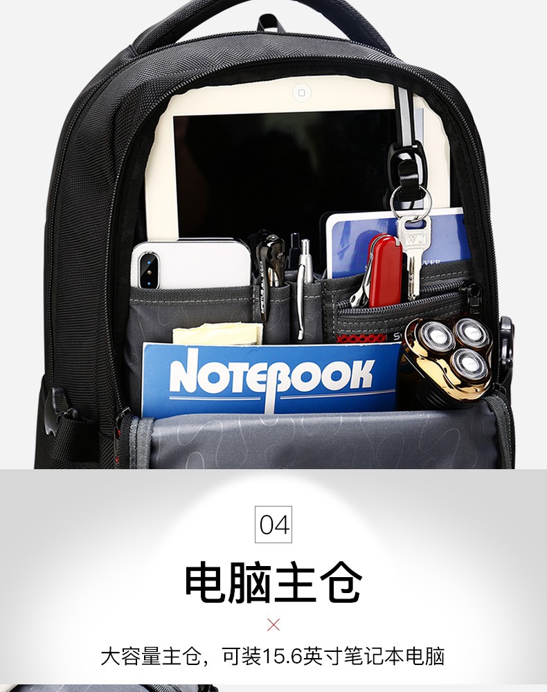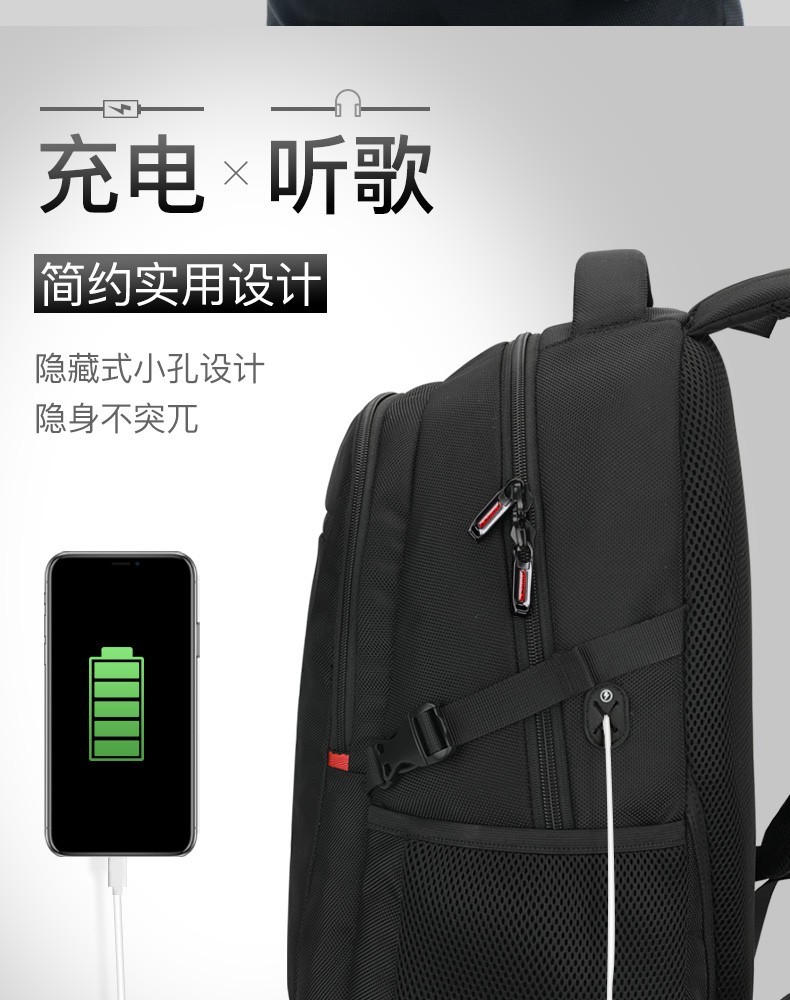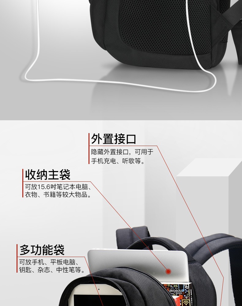 型 號(hào):88042 大號(hào) 尺 寸:470*330*200(MM)大號(hào) 材 質(zhì):織物 顏 色:黑色 重 量:0.925kg 2.采用優(yōu)質(zhì)滌綸材料 防潑水; 3.超大容量設(shè)計(jì)可放15寸電腦; 4.外置USB接口可直接連接手機(jī)充電; 5.主袋內(nèi)加厚電腦隔層; 6.彈力蜂窩背板、透氣、緩壓、減震