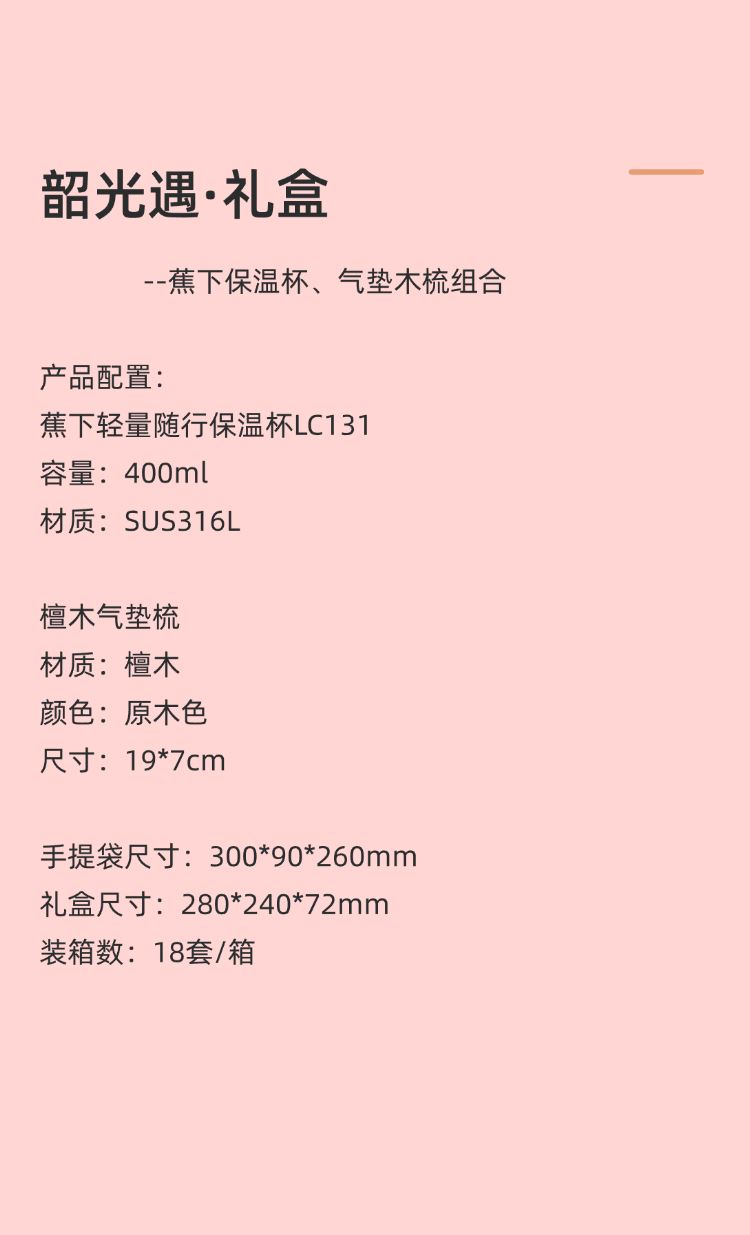 產(chǎn)品配置: 蕉下輕量隨行保溫杯LC131 容量:400ml 材質(zhì):SUS316L 檀木氣墊梳 材質(zhì):檀木 顏色:原木色 尺寸:19*7cm 手提袋尺寸:300*90*260mm 禮盒尺寸:280*240*72mm