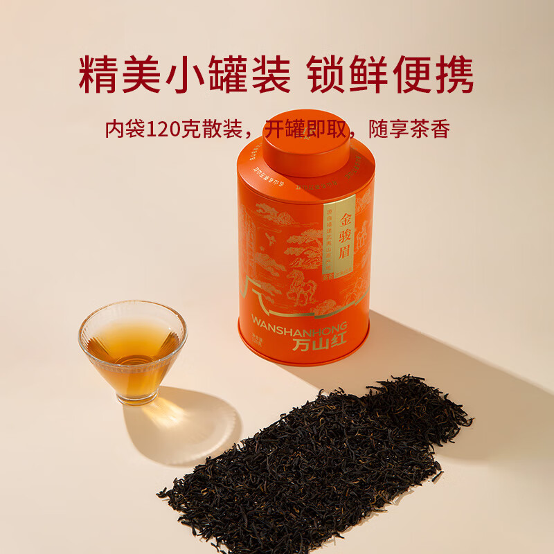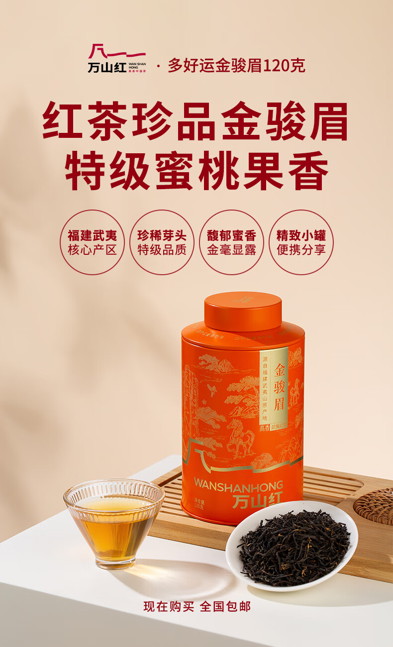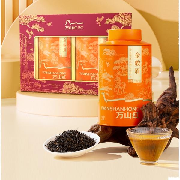 凈含量:240克 組合方式:特級武夷紅茶金駿眉120克*2罐 產(chǎn)品賣點: 國風禮贈包裝:紅金撞色搭配國風山水、飛鳥紋樣,視覺喜慶,契合傳統(tǒng)審美,顏值適配節(jié)日、商務等禮贈場景。 雙罐禮盒配置:雙罐組合的規(guī)整禮盒裝,分量適中且包裝精致,禮贈時既顯誠意,自飲也方便收納 / 分享。 寓意加分屬性:“萬山紅” 命名自帶 “紅火大氣” 的美好寓意,送禮時能傳遞更飽滿的心意與祝福。