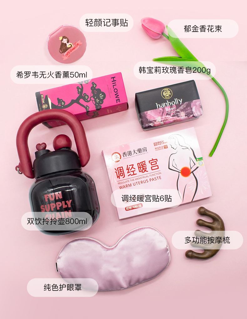 包裝尺寸:38*30*10cm 雙飲拎拎壺水杯:800ml 藤枝無(wú)香薰:50ml 多功能按摩梳 輕顏記事貼 調(diào)經(jīng)暖宮貼:6貼 韓寶莉玫瑰香皂:200g 純色眼罩 郁金香花束