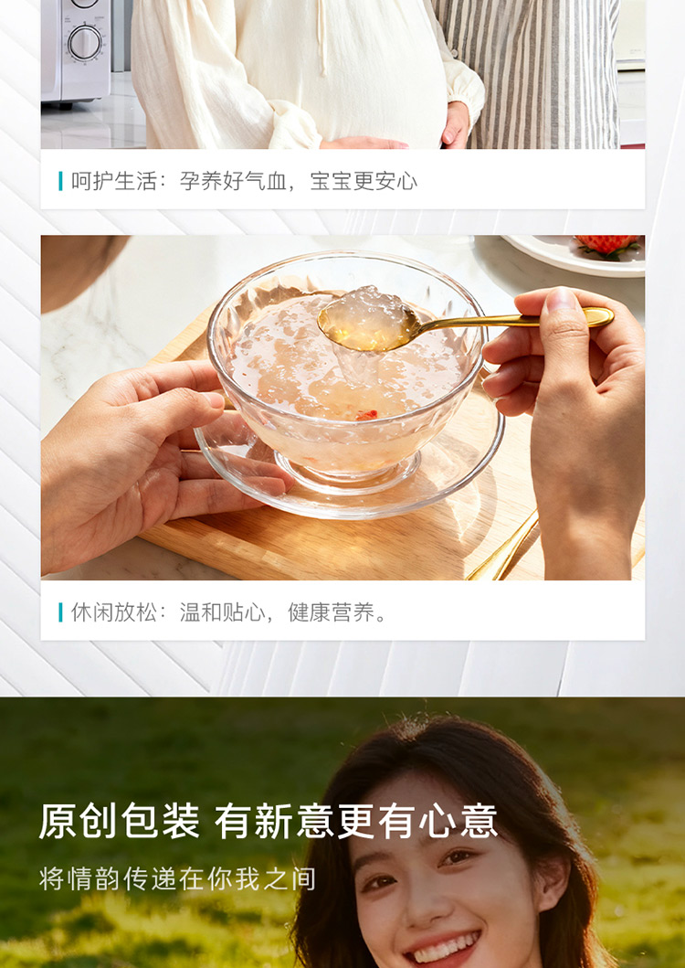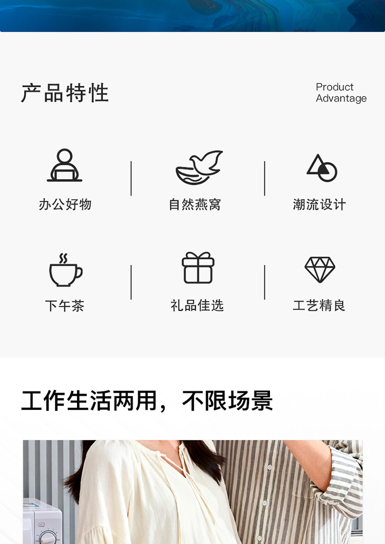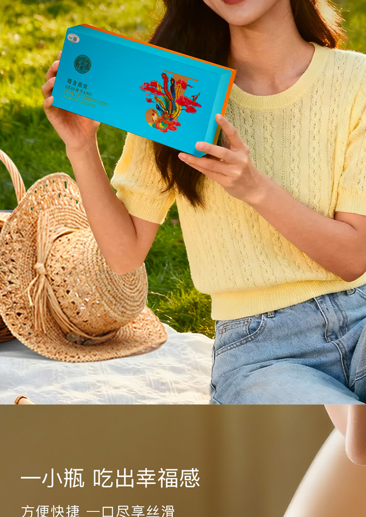 配置:4瓶/盒固形物含量≥25% 干燕窩投料:1.1克 凈含量:70克*4瓶(280克) 配料:水、冰糖、燕窩 食用方法:開蓋即食,陰涼干燥處儲(chǔ)存。 產(chǎn)品特點(diǎn): 全新包裝設(shè)計(jì),延續(xù)清新的靛藍(lán)色風(fēng)格; 4瓶便攜裝即食燕窩,低脂低糖,補(bǔ)充膠原蛋白; 適用于女性輕滋補(bǔ),公司福利、銀行保險(xiǎn)行業(yè)中低價(jià)禮品系列。