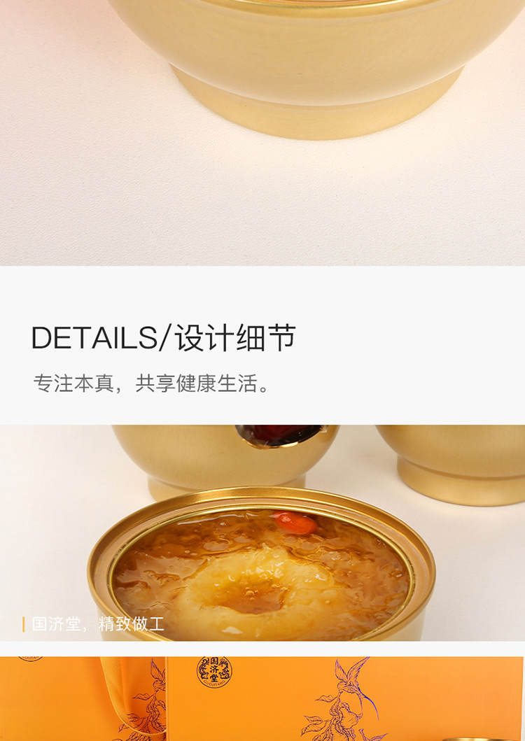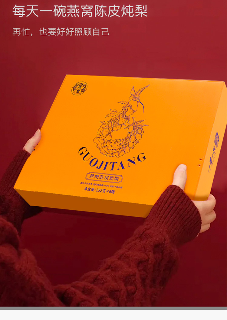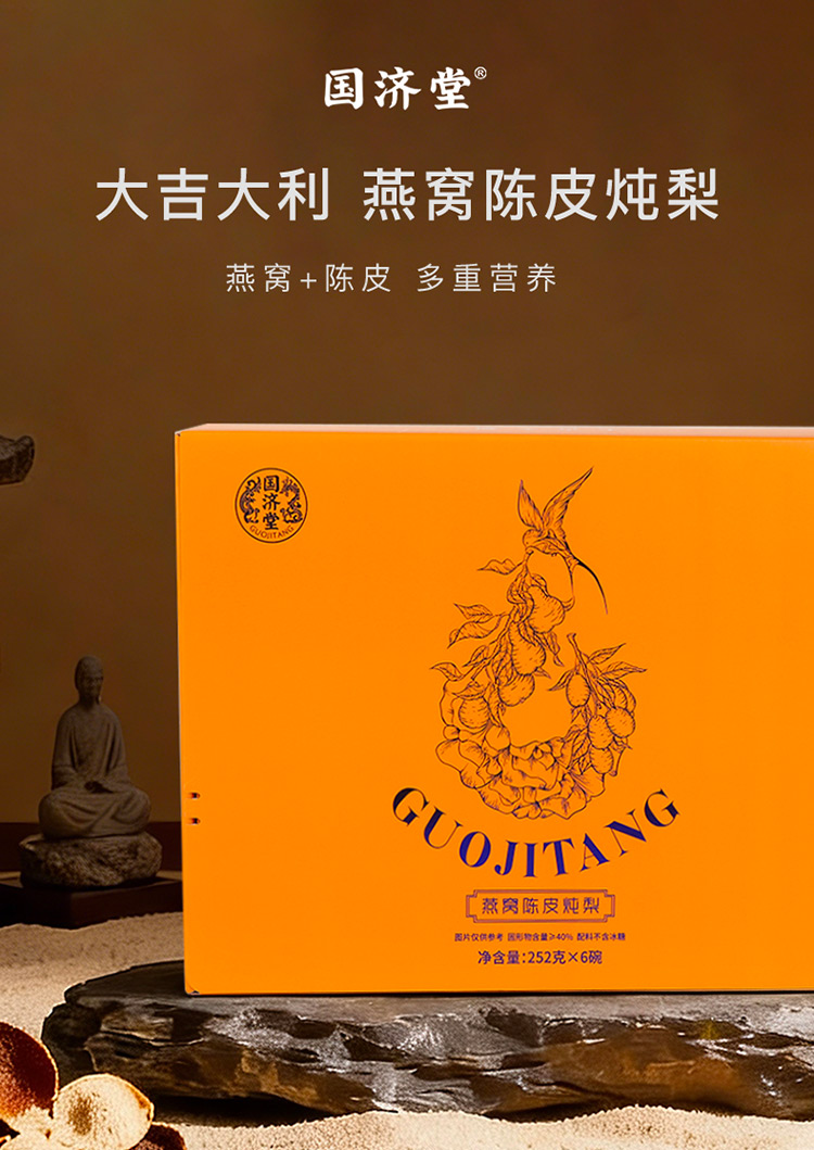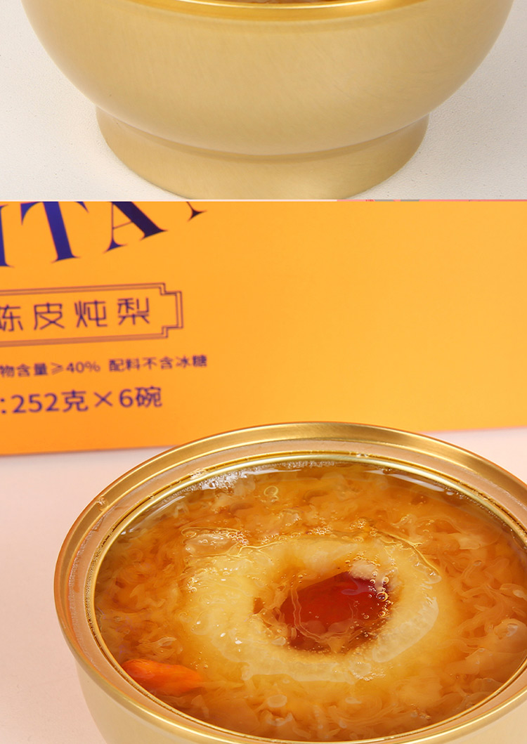 配置:252克/碗×6碗 固形物含量≥40% 凈含量:1.512千克 配料:水、梨、木糖醇、陳皮、 紅棗、枸杞、銀耳、燕窩。 食用方法:開蓋即食 貯存條件:置于陰涼干燥處貯存。 保質期:12個月 國濟堂2024迎龍年新品,傳統(tǒng)金黃色配色,對龍年的吉祥寓意; 燉梨甜水的新搭配,加入燕窩、陳皮、枸杞、銀耳等滋補好物; 口感清甜軟糯,滿滿一碗補充能量。一盒6碗, 配料純凈無添加,堅持純粹品質。