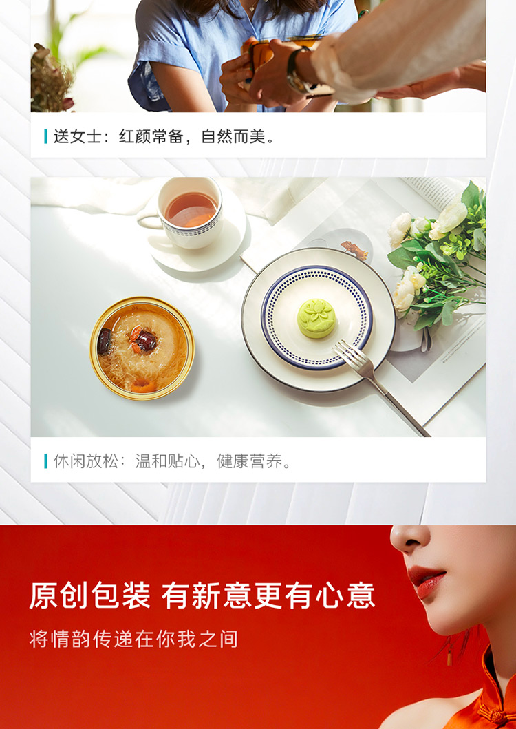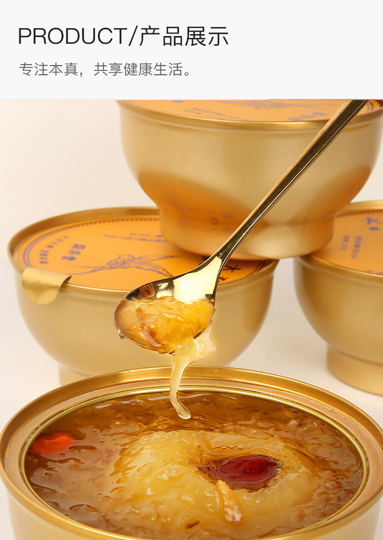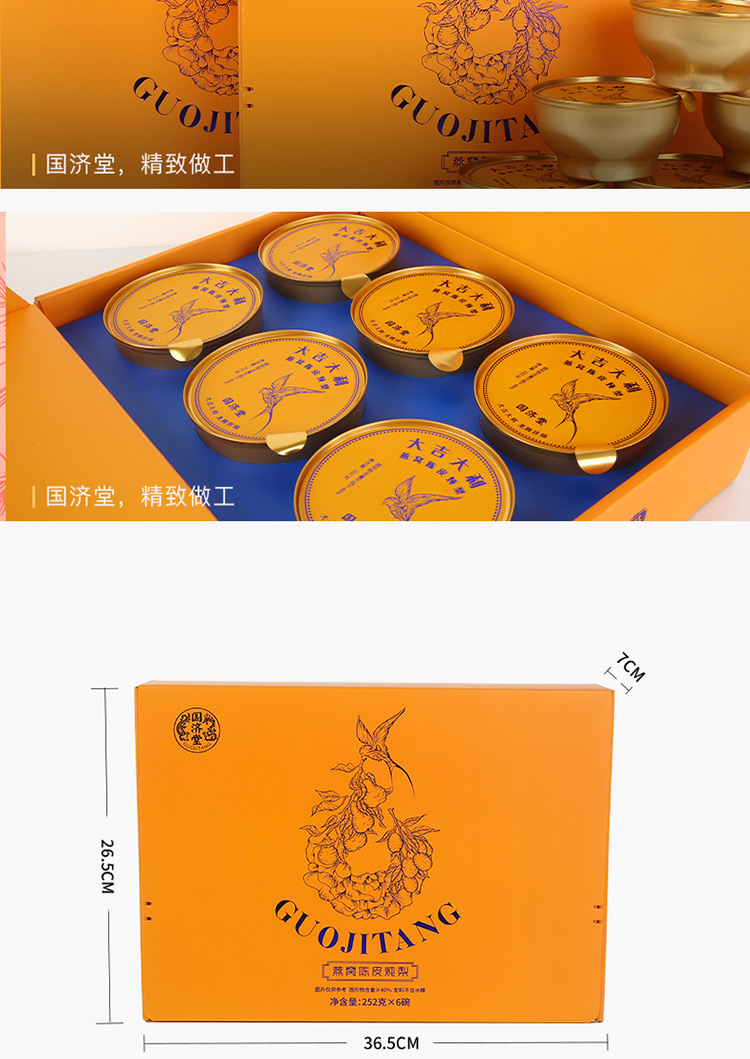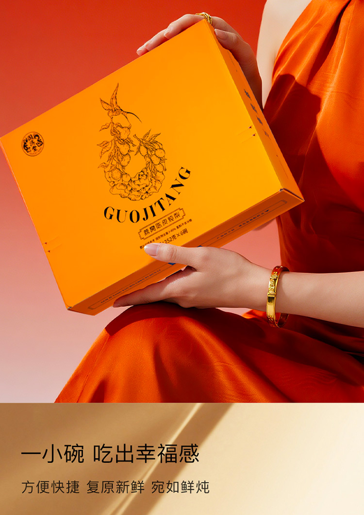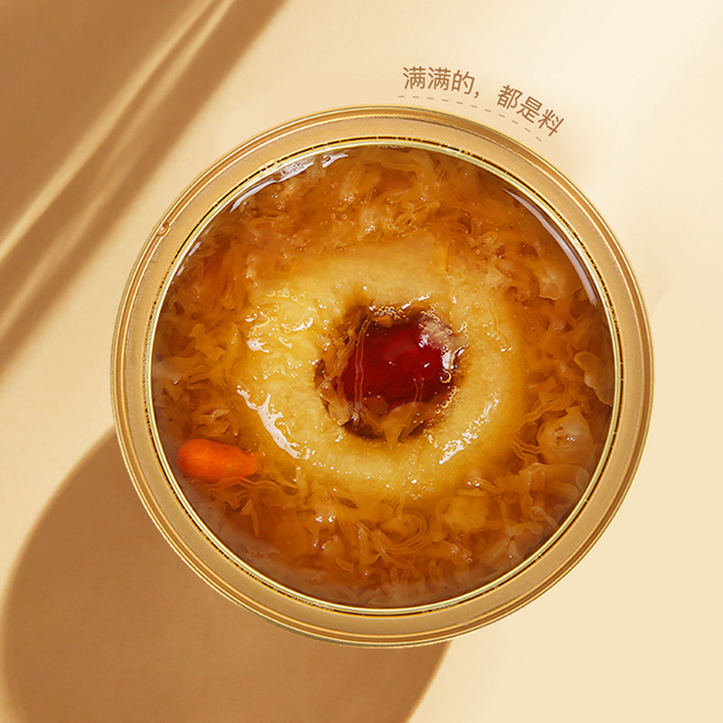 配置:252克/碗×6碗 固形物含量≥40% 凈含量:1.512千克 配料:水、梨、木糖醇、陳皮、 紅棗、枸杞、銀耳、燕窩。 食用方法:開蓋即食 貯存條件:置于陰涼干燥處貯存。 保質期:12個月 國濟堂2024迎龍年新品,傳統(tǒng)金黃色配色,對龍年的吉祥寓意; 燉梨甜水的新搭配,加入燕窩、陳皮、枸杞、銀耳等滋補好物; 口感清甜軟糯,滿滿一碗補充能量。一盒6碗, 配料純凈無添加,堅持純粹品質。