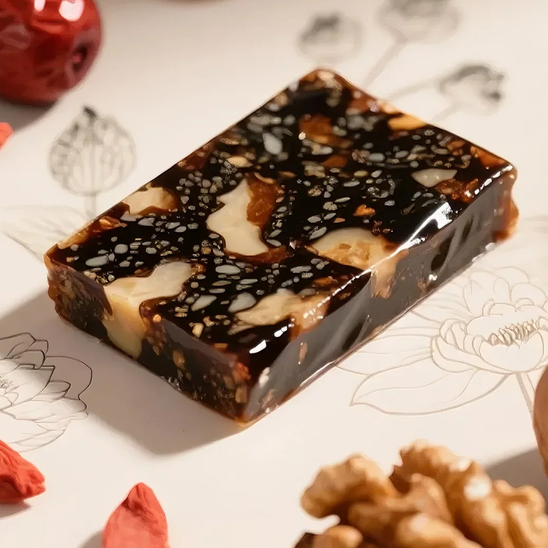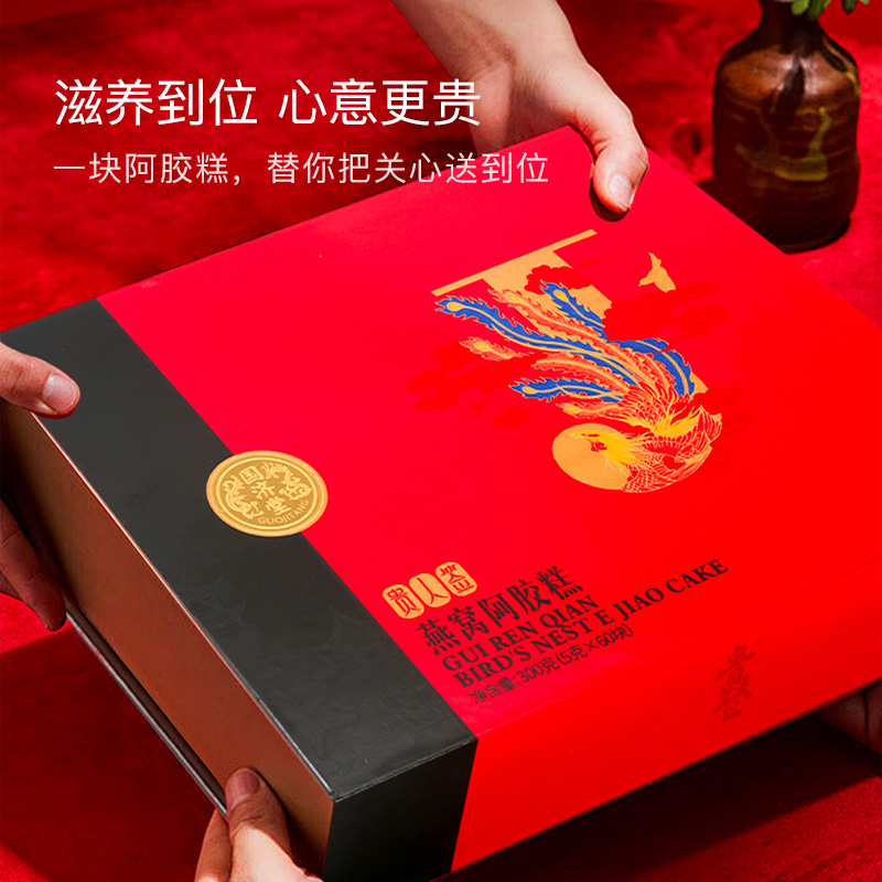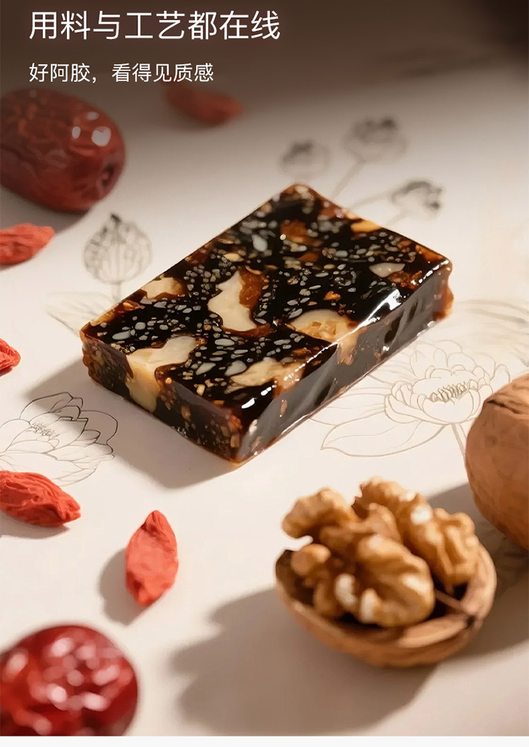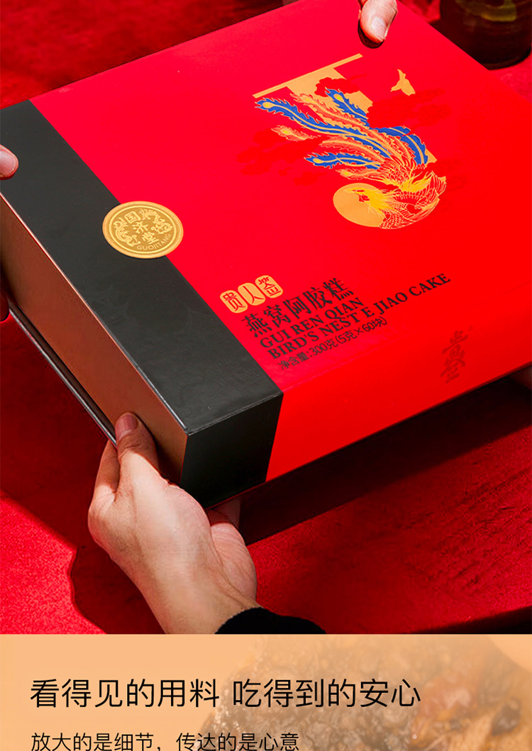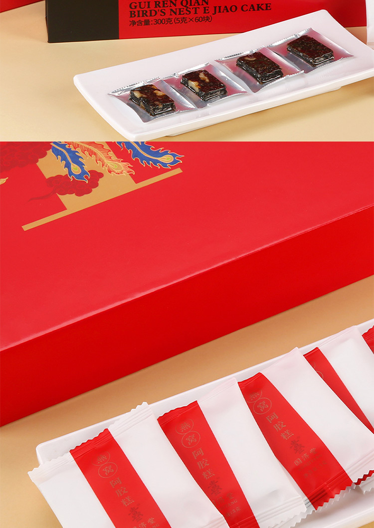 配置:60片/盒 濕品添加量6‰ 凈含量:300克(5克×60片) 配料:黑芝麻、麥芽糊精 、核桃仁、黃酒、阿膠(添加量≥12%)、多晶體冰糖、麥芽糖漿、銀耳、燕窩 食用方法:開袋即食 保質(zhì)期:12個月 禮盒尺寸:33*27*4.6cm
