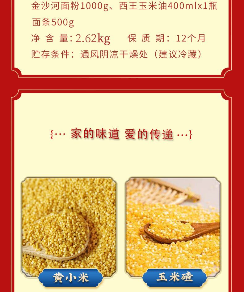 禮盒:捎回家禮包 凈含量:2.62kg 產(chǎn)品規(guī)格配置:山野小米500g、玉米碴250g、金沙河面粉1000g 江瀧掛面500g、西王玉米油400ml 盒尺寸:42*11.5*28.5cm裝 箱重量:14.75kg 箱尺寸:59.5*43*30 箱體積:0.077方