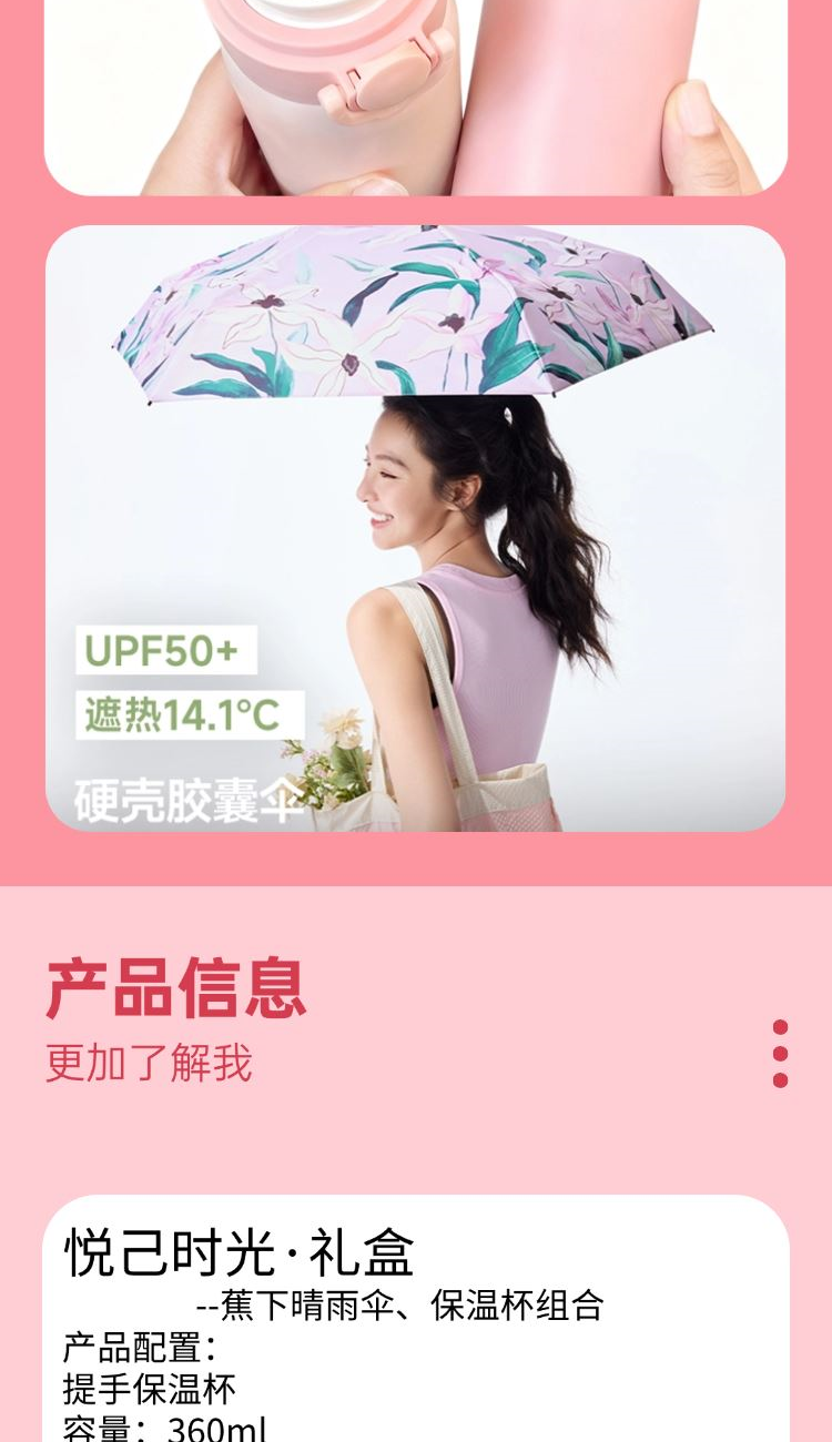 產(chǎn)品配置: 提手保溫杯 容量:360ml 材質(zhì):內(nèi)底316/內(nèi)外304不銹鋼 杯蓋:食品級(jí)PP+硅膠 蕉下五折黑膠防曬傘BM663 旗艦L.R.C黑膠 UPF50+防曬遮熱 紫外線阻隔率≥99.99% 手提袋尺寸:300*90*260mm 禮盒尺寸:280*240*72mm