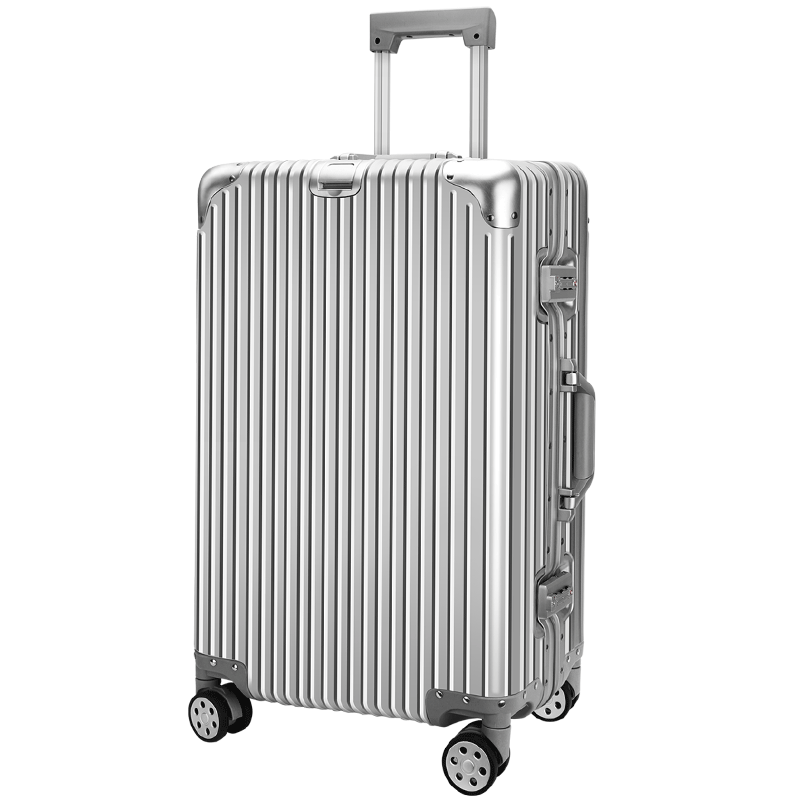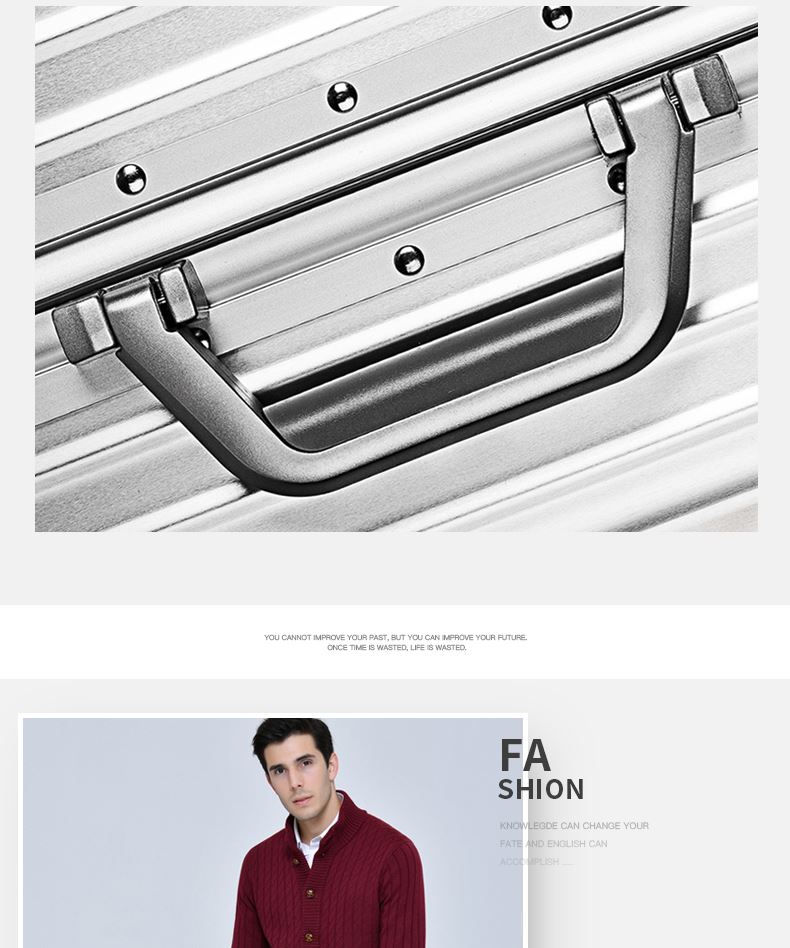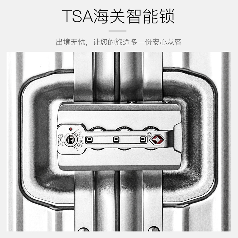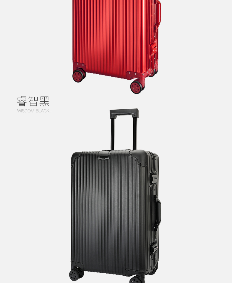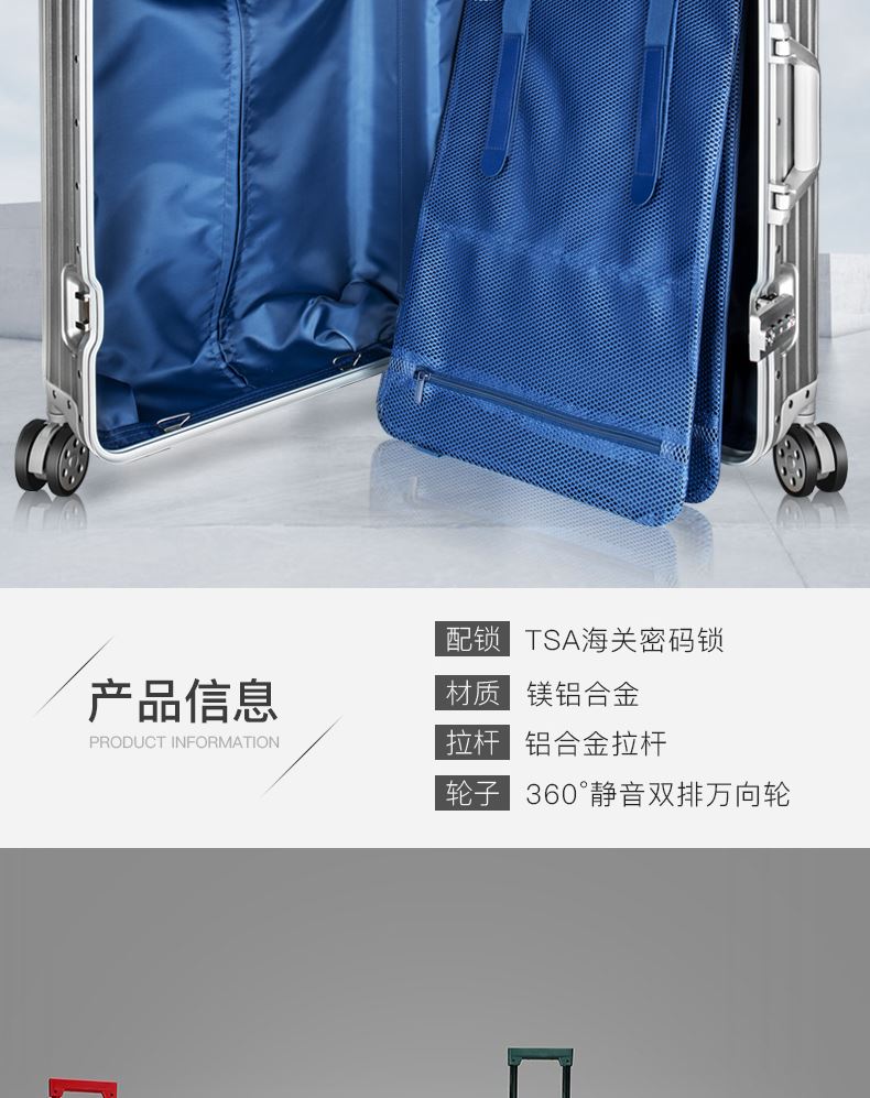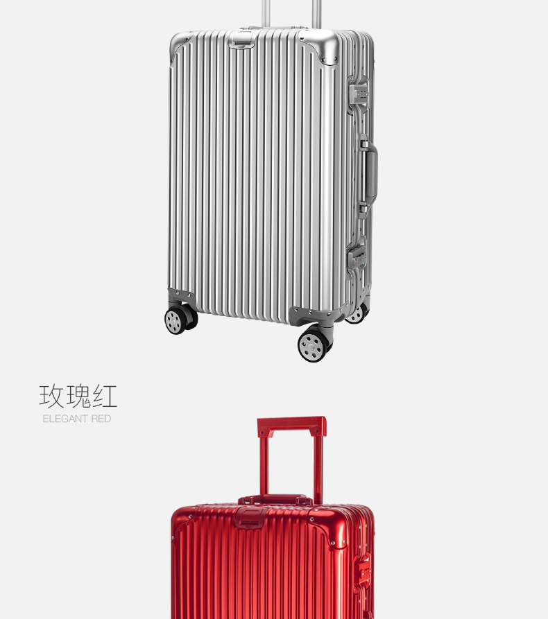 型 號:22001 尺 寸:24英寸 顏 色:銀色/黑色/紅色/鈦金色/粉色/藍(lán)色/綠色 描述: 箱體材質(zhì):航空級別全鋁鎂合金材質(zhì),板材厚度1mm,采用高純度鋁合金材質(zhì)包角。 手柄:采用ABS材質(zhì)慢回彈手柄,新型舒適靜音防夾提手。 2、拉桿:航空級加厚鋁合金拉桿 3、輪滑:TPE加厚輪胎,順滑軸承雙排360°萬向靜音輪。 4、密碼鎖:TSA海關(guān)密碼鎖,不易亂碼,無損開箱安全性。 5、拉鏈:金屬拉頭,拉鏈牙采用優(yōu)質(zhì)尼龍
