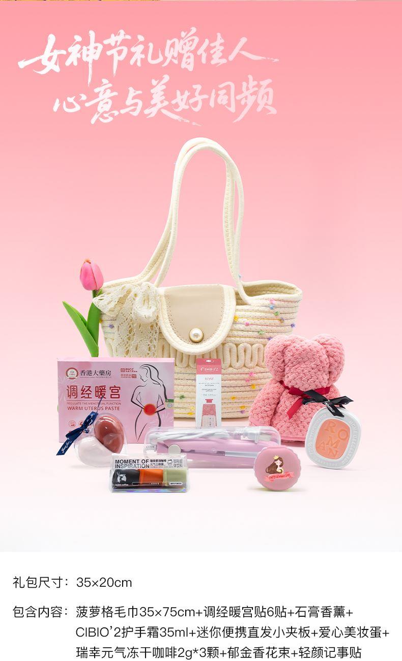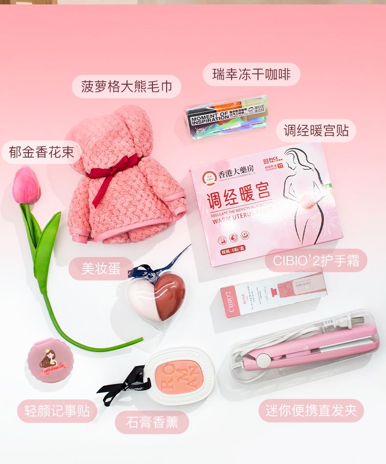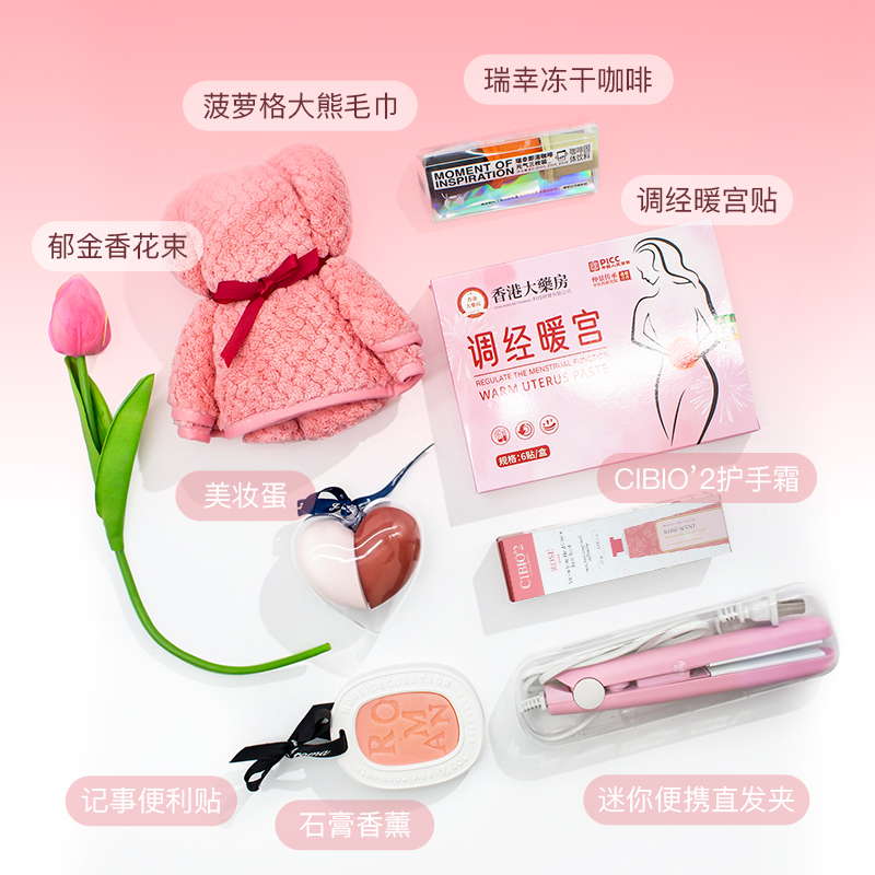 包裝尺寸:35*20cm 瑞幸元氣凍干咖啡:2g*3顆 菠蘿格毛巾:35*75cm 迷你便攜直發(fā)小夾板 石膏香薰 CIBIO'2護手霜:35ml 調(diào)經(jīng)暖宮貼:6貼 愛心美妝蛋 郁金香花束 輕顏記事貼