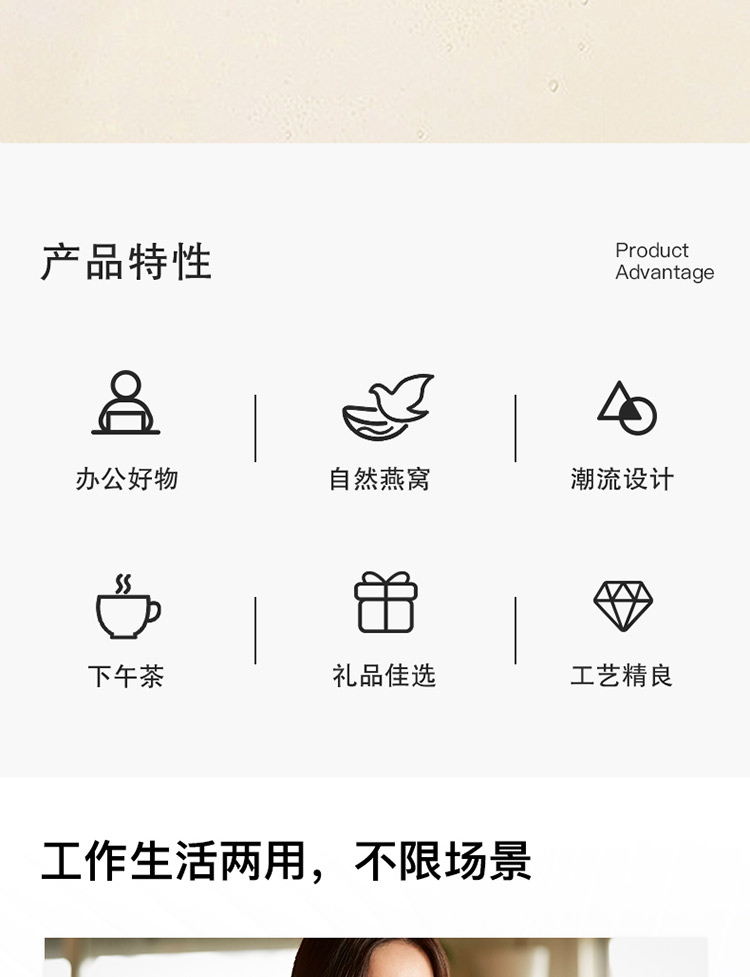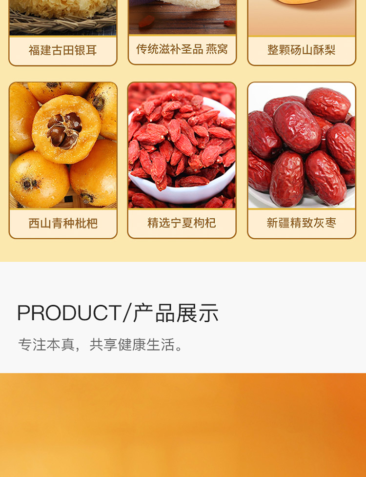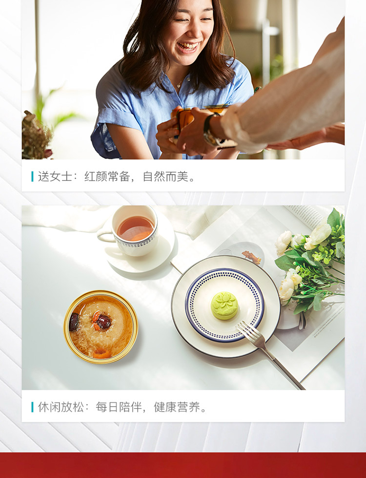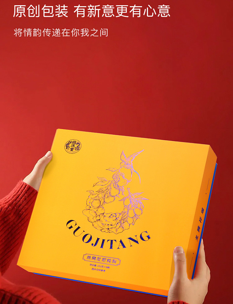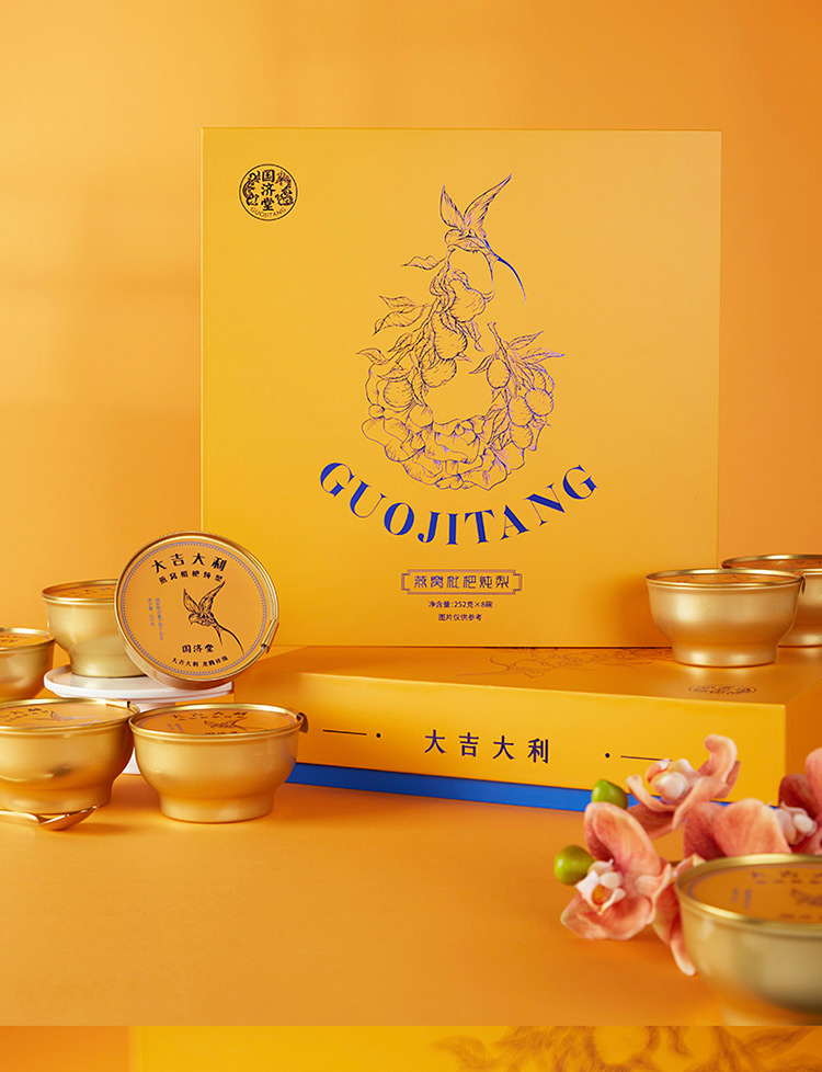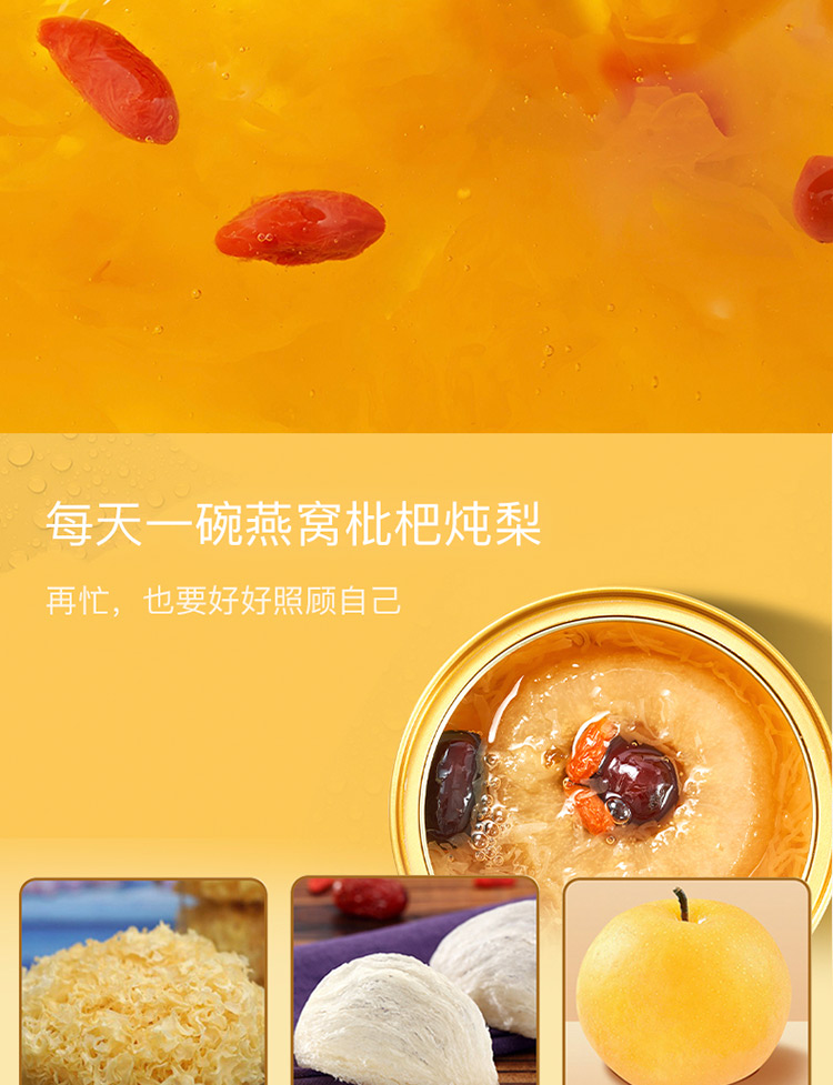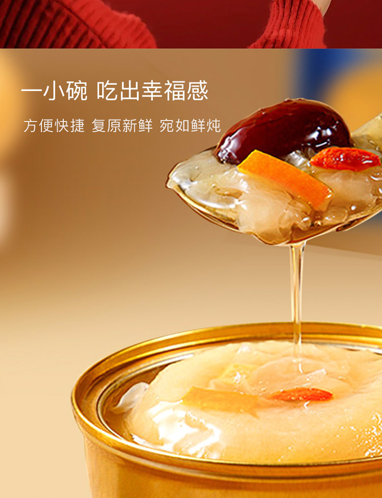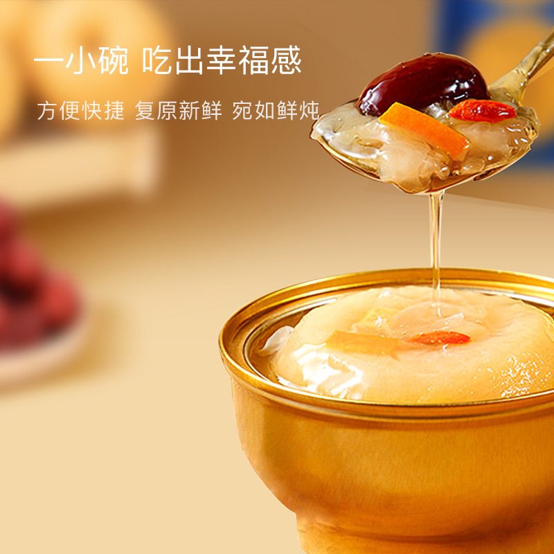 傳統(tǒng)金黃色配色,對龍年的吉祥寓意; 燉梨甜水的新搭配, 加入燕窩、枇杷、銀耳等滋補好物, 增強潤燥; 口感清甜軟糯,滿滿一碗補充能量。 一盒8碗, 配料純凈無添加,堅持純粹品質。