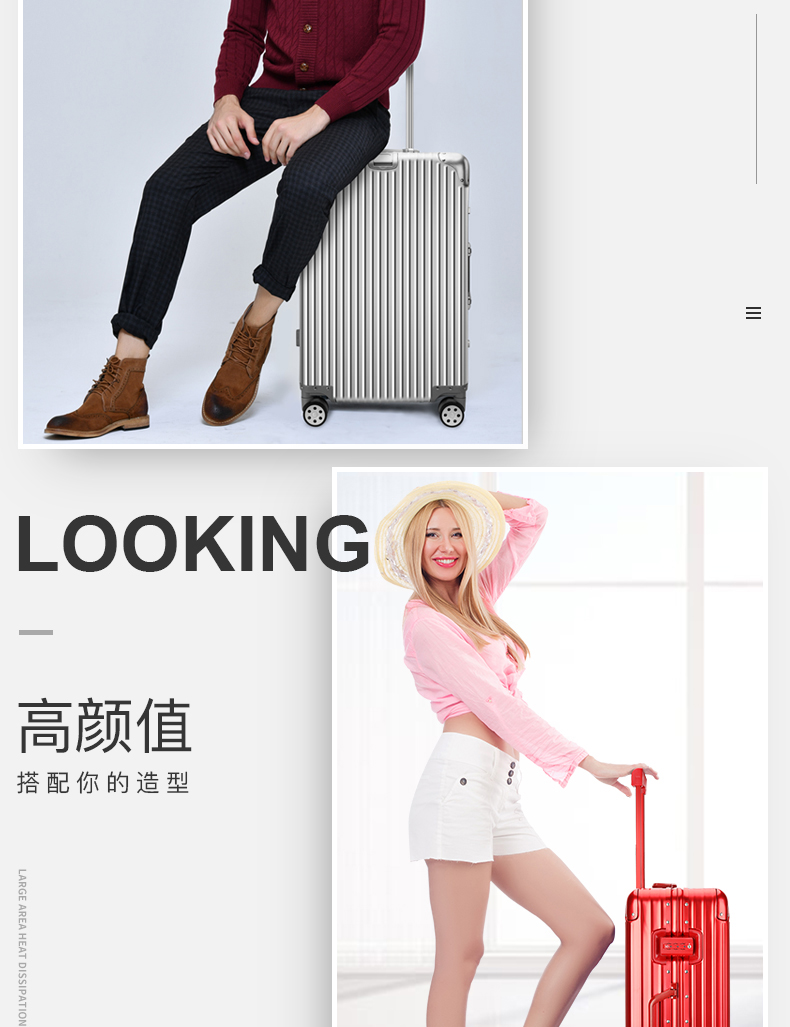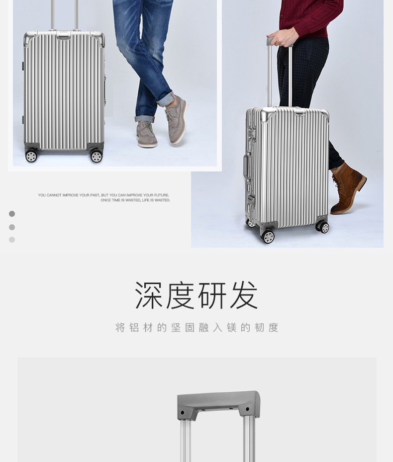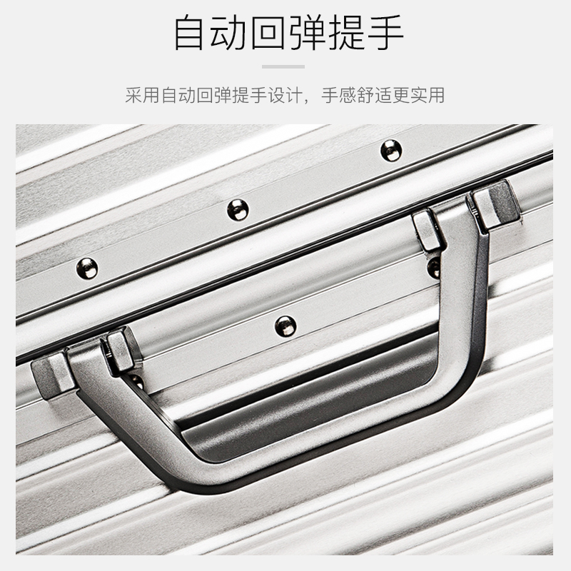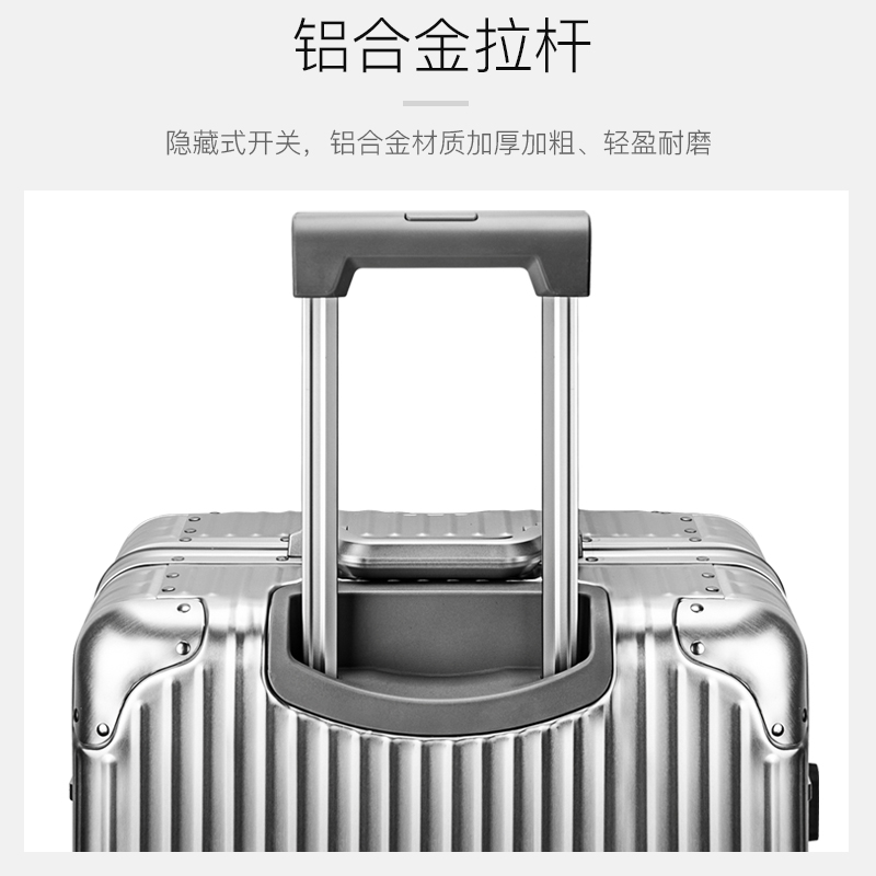 型 號(hào):22001 尺 寸:26英寸 材 質(zhì):鋁鎂合金 顏 色:銀色/黑色/紅色/鈦金色/粉色/藍(lán)色/綠色 描述: 箱體材質(zhì):航空級(jí)別全鋁鎂合金材質(zhì),板材厚度1mm,采用高純度鋁合金材質(zhì)包角。 手柄:采用ABS材質(zhì)慢回彈手柄,新型舒適靜音防夾提手。 2、拉桿:航空級(jí)加厚鋁合金拉桿 3、輪滑:TPE加厚輪胎,順滑軸承雙排360°萬(wàn)向靜音輪。 4、密碼鎖:TSA海關(guān)密碼鎖,不易亂碼,無(wú)損開(kāi)箱安全性。 5、拉鏈:金屬拉頭,拉鏈牙采用優(yōu)質(zhì)尼龍
